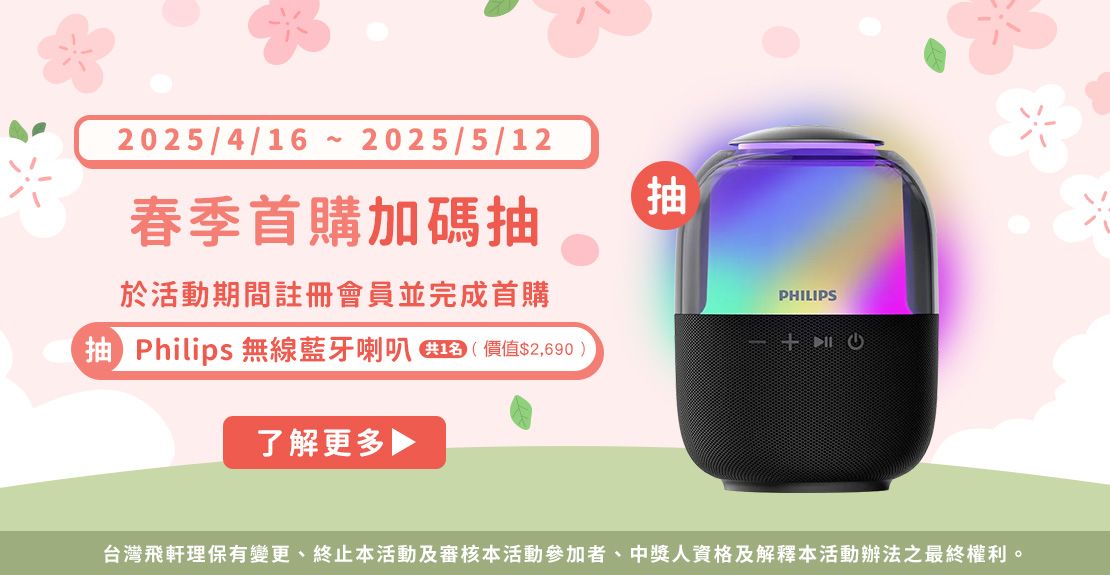 - 活動辦法: 飛利浦家電會員於2025年4月16日-2025年5月12日完成首次註冊流程,且活動期間內於飛利浦家電官方網站或直營百貨專櫃,任一筆消費訂單(不含運費),即享有抽獎PHILIPS無線藍牙喇叭資格,以訂單成立日期為準,且訂單付款完成,經確認無取消/退貨。