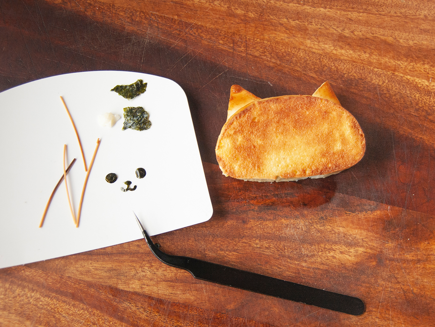 氣炸好的饅頭片,再貼上海苔稍稍裝飾,最後插上煎麵條當鬍子,可愛的喵咪饅頭就完成囉!