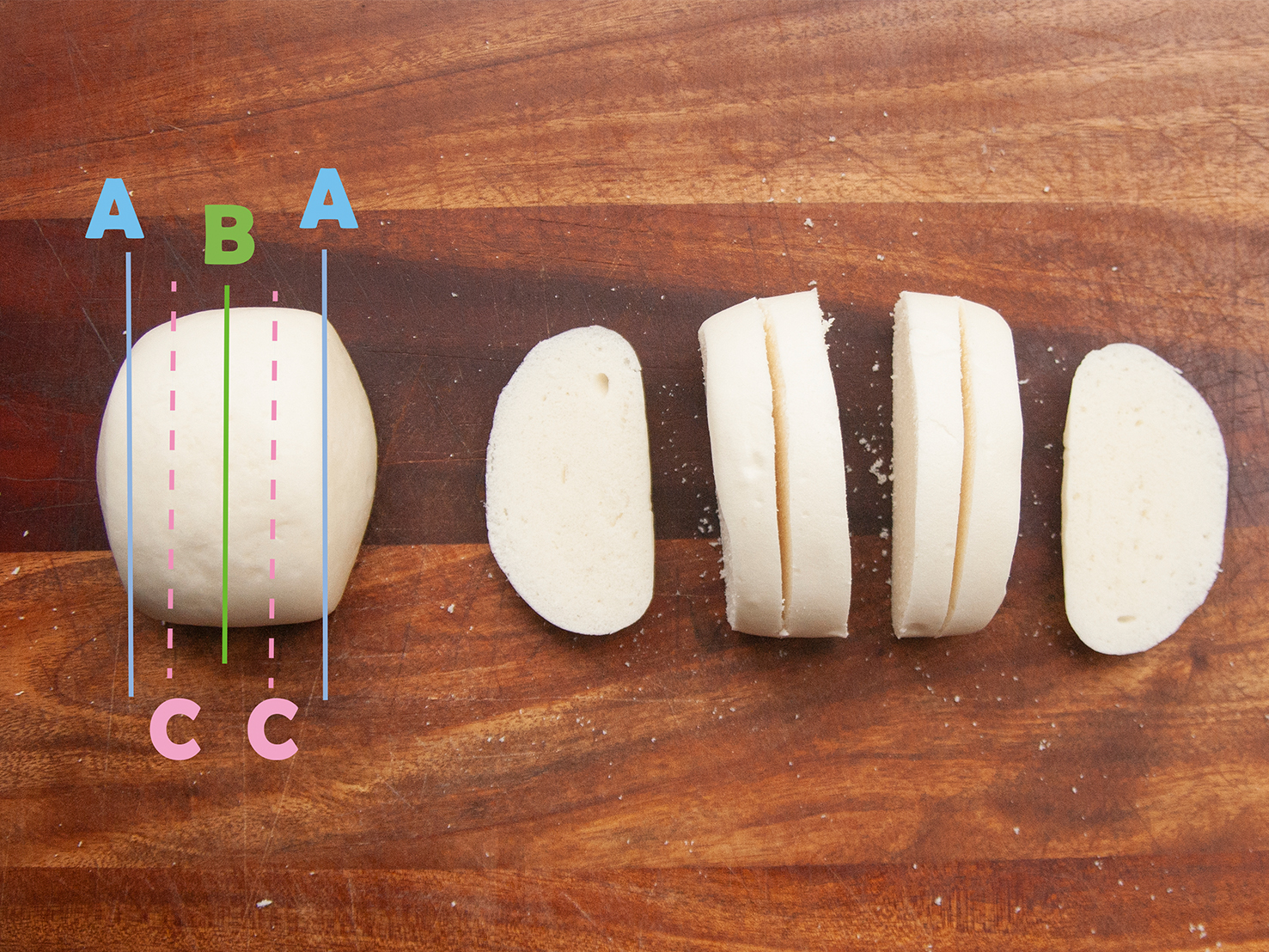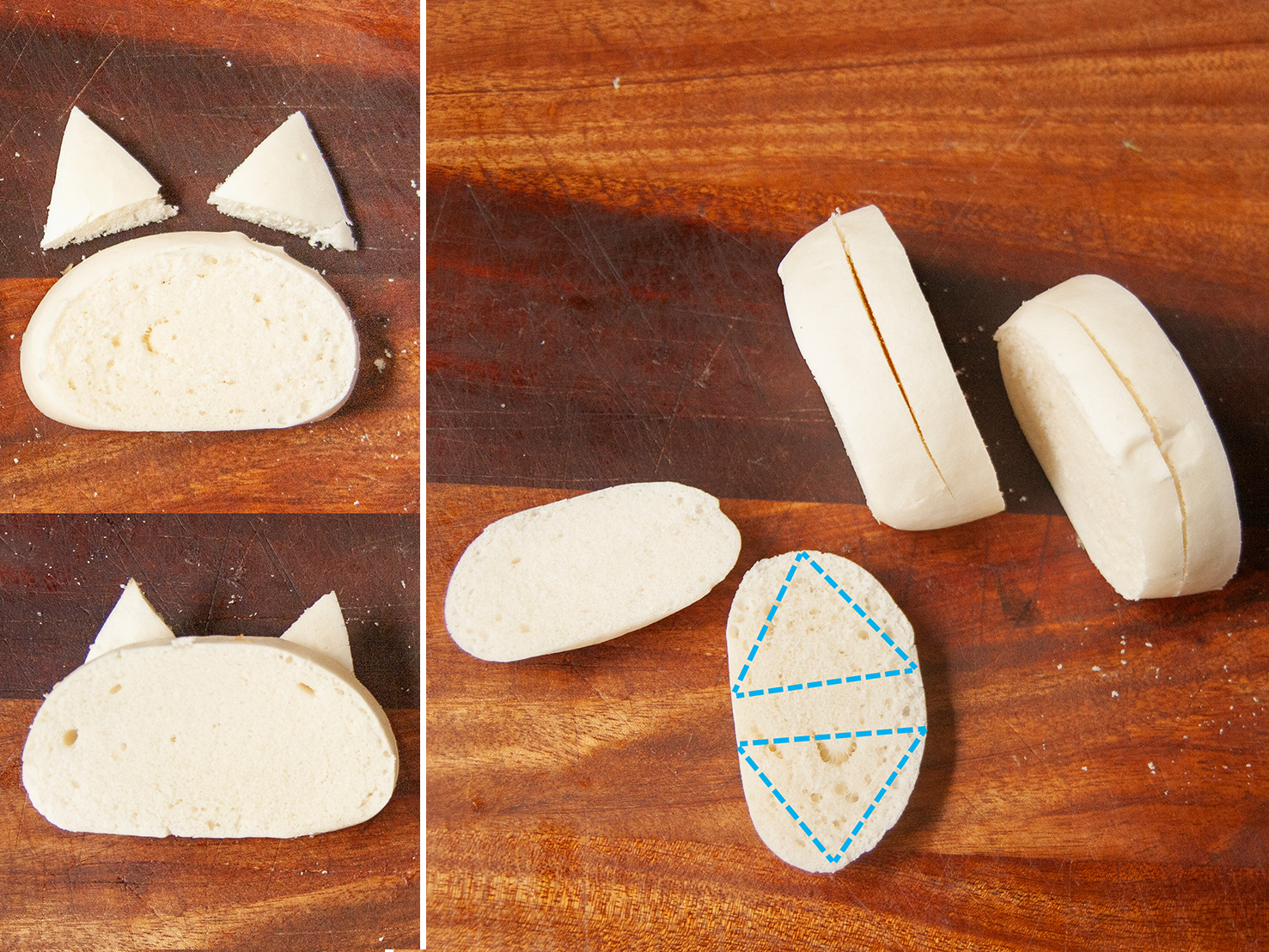 (C)最後將切下的2片饅頭中再各劃一刀,但不切到底(做為夾餡用)