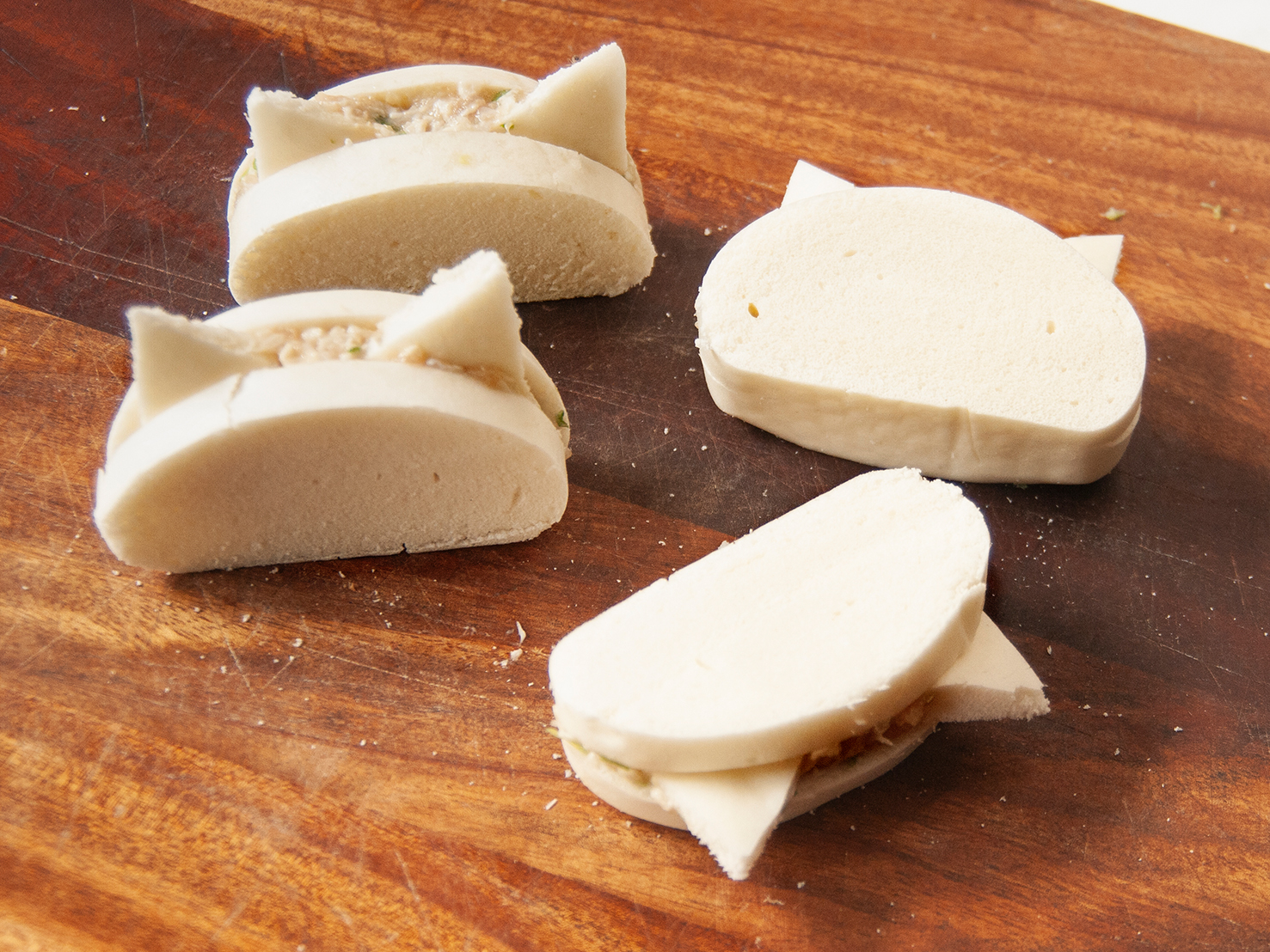 將拌好的內餡填入饅頭縫裡,並夾入2個耳朵。