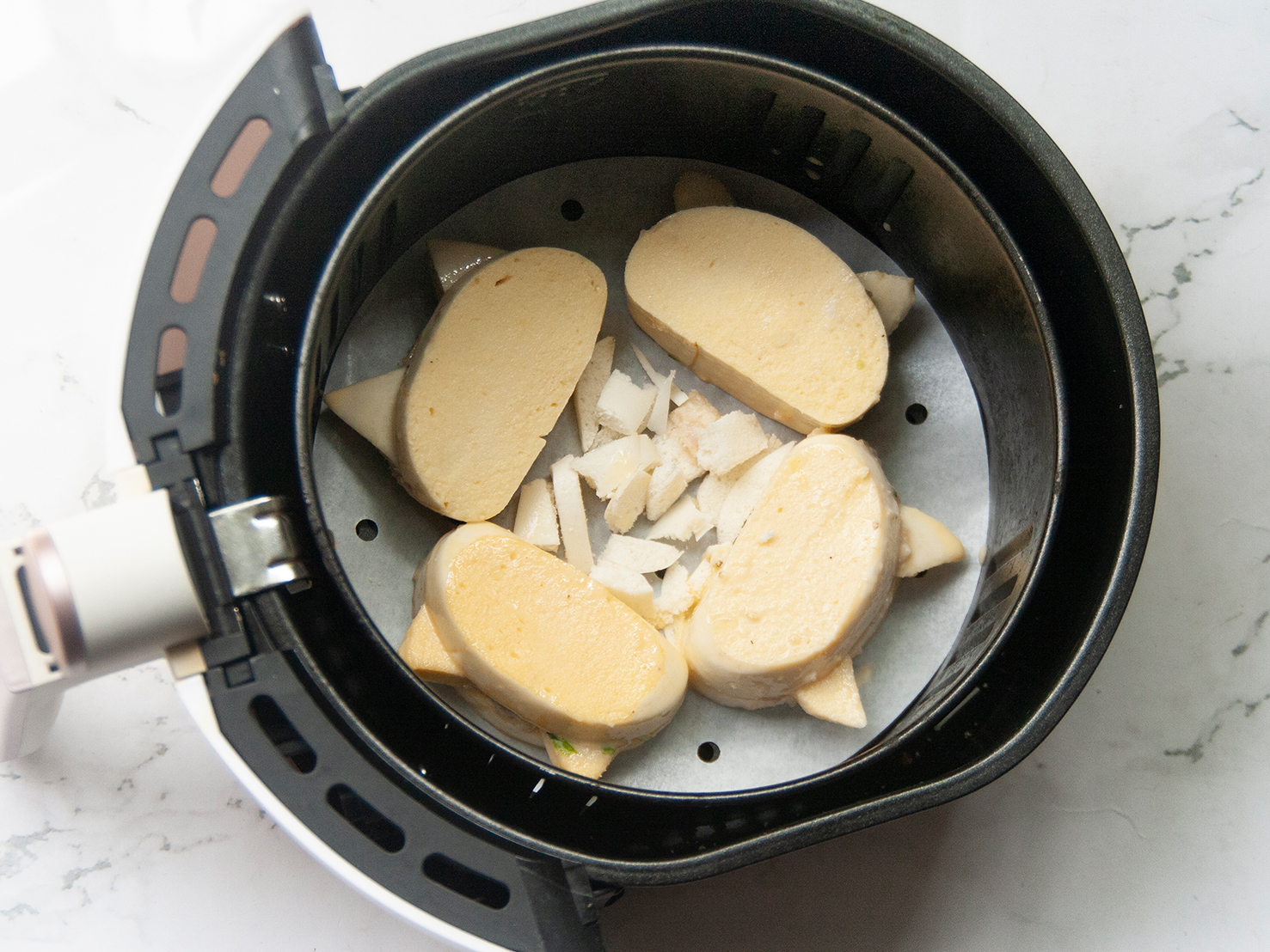 夾好內餡的饅頭每一面均勻沾裹上調好的蛋液,並放入飛利浦氣炸鍋中以180度氣炸5分鐘即可。